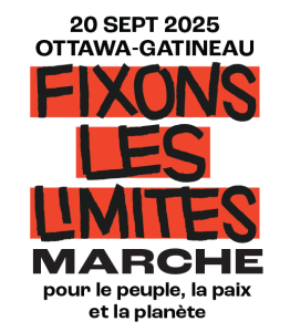 La marche FIXONS LES LIMITES 2025 d’Ottawa-Gatineau fait partie d’une mobilisation mondiale et journée nationale d’action pour exiger ensemble la justice dans tous les aspects de notre vie. Ce mouvement va au-delà du climat : nous sommes solidaires des mouvements autochtones, migrants, économiques, raciaux et pacifistes qui œuvrent pour un avenir meilleur :